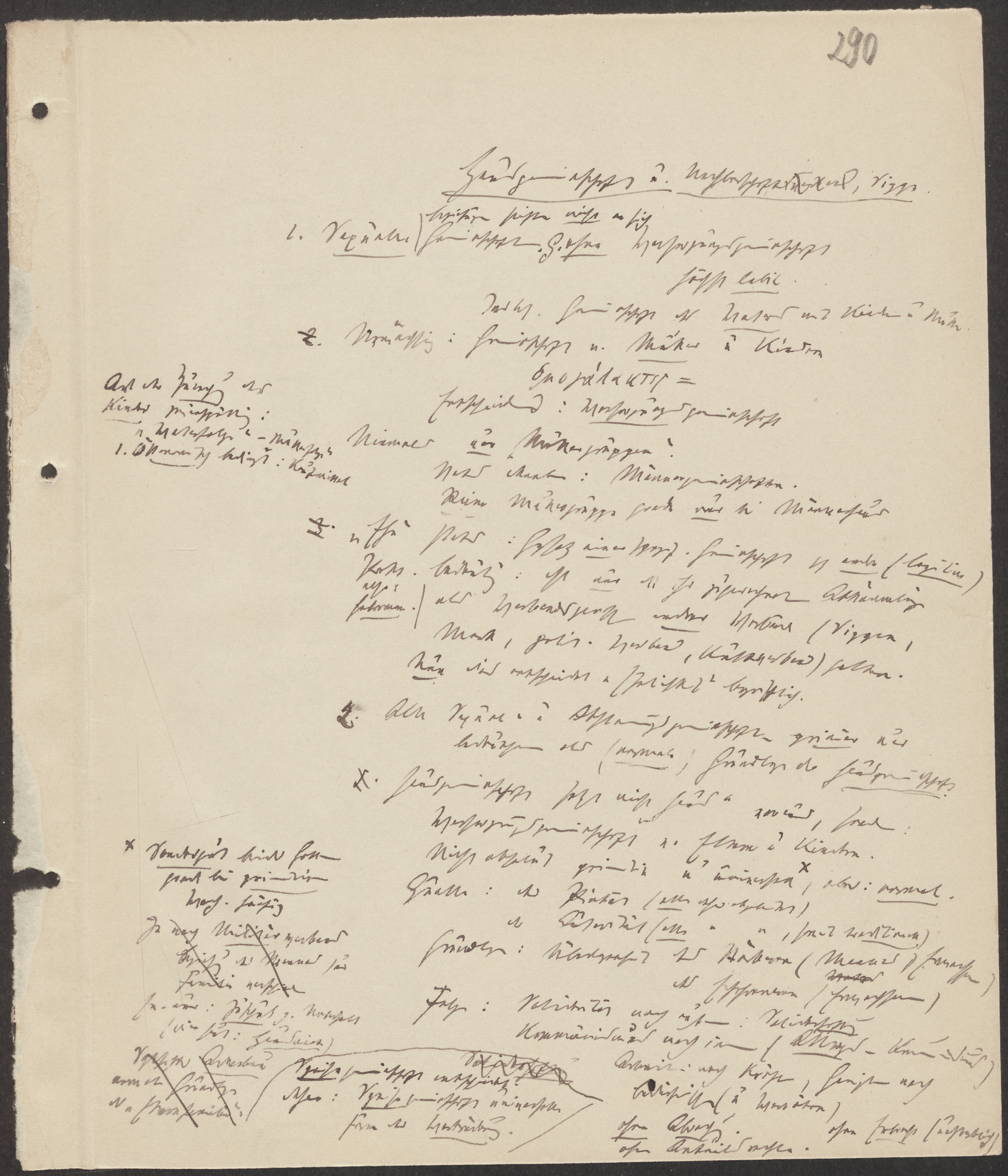 waren zunächst in 8 Abschnitte (mit arabischer Bezifferung) untergliedert, doch wurde vermutlich noch im [284]gleichen Arbeitsgang eine neue Gliederung in 5, ebenfalls mit arabischen Ziffern bezeichnete Abschnitte vorgenommen, und zwar mit demselben Stift, so daß eine spätere Überarbeitung ausgeschlossen werden kann. An die Behandlung des „Stamms“ als einer Primärform einer politischen Gemeinschaft schließen sich Ausführungen über das „Verhältnis zwischen: Haus, Dorf, Sippe, Stamm“ unmittelbar an. Auf Bl. 294–295 Vgl. unten, S. 291–296.