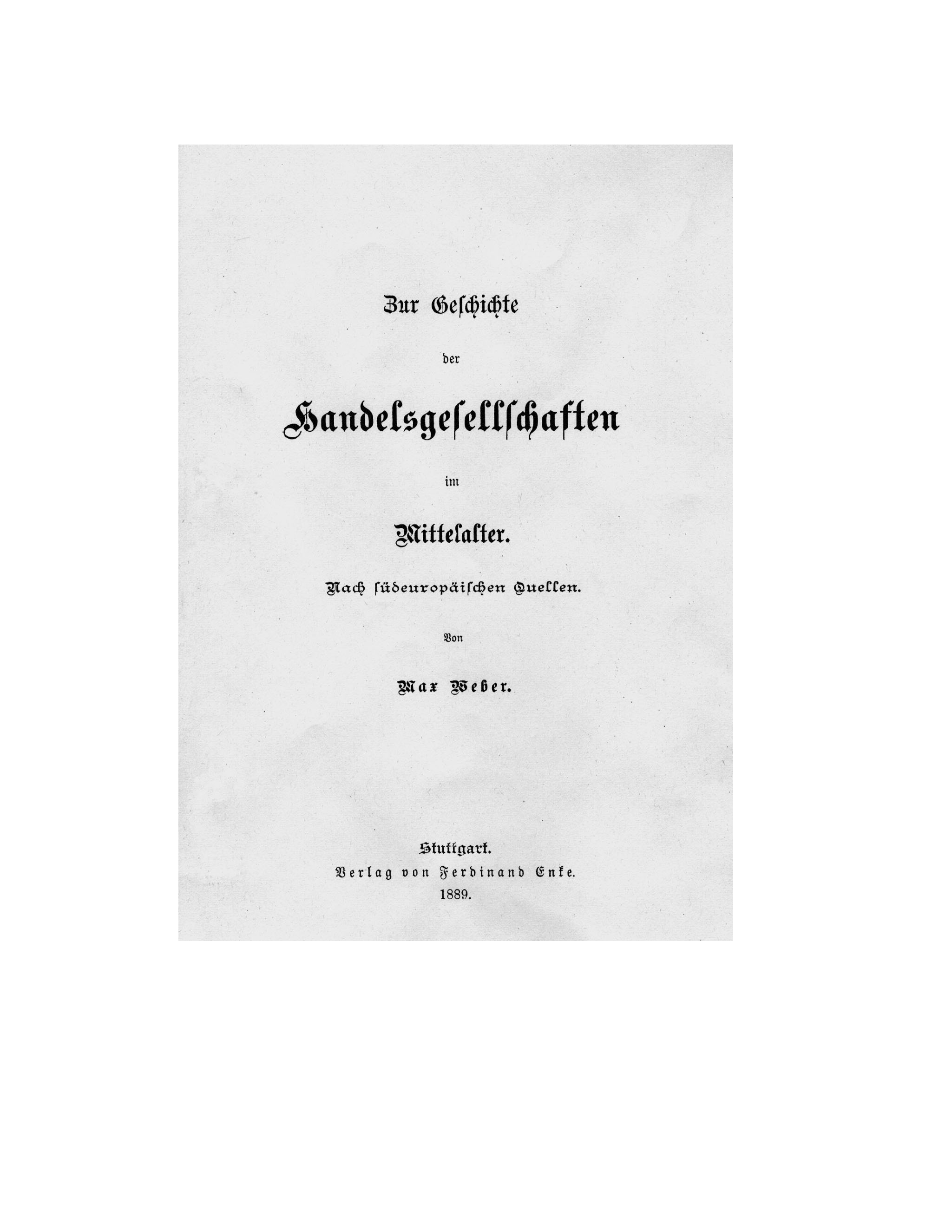 Als gedrucktes Buch erschien Webers Langfassung dann unter dem Titel „Zur Geschichte der Handelsgesellschaften im Mittelalter“ und wurde durch den Verlag Ferdinand Enke, Stuttgart ab dem 7. Oktober 1889 zum Preis von 6.– Mark vertrieben.[128] Bei der Druckfassung „Entwickelung des Solidarhaftprinzips“ fand sich in der Kopfzeile nur eine einfache Paginierungsangabe (mittig und mit Strichen versehen, z. B. – 50 –), während bei der Langfassung zur „Geschichte der Handelsgesellschaften“ Kolumnentitel eingefügt wurden.