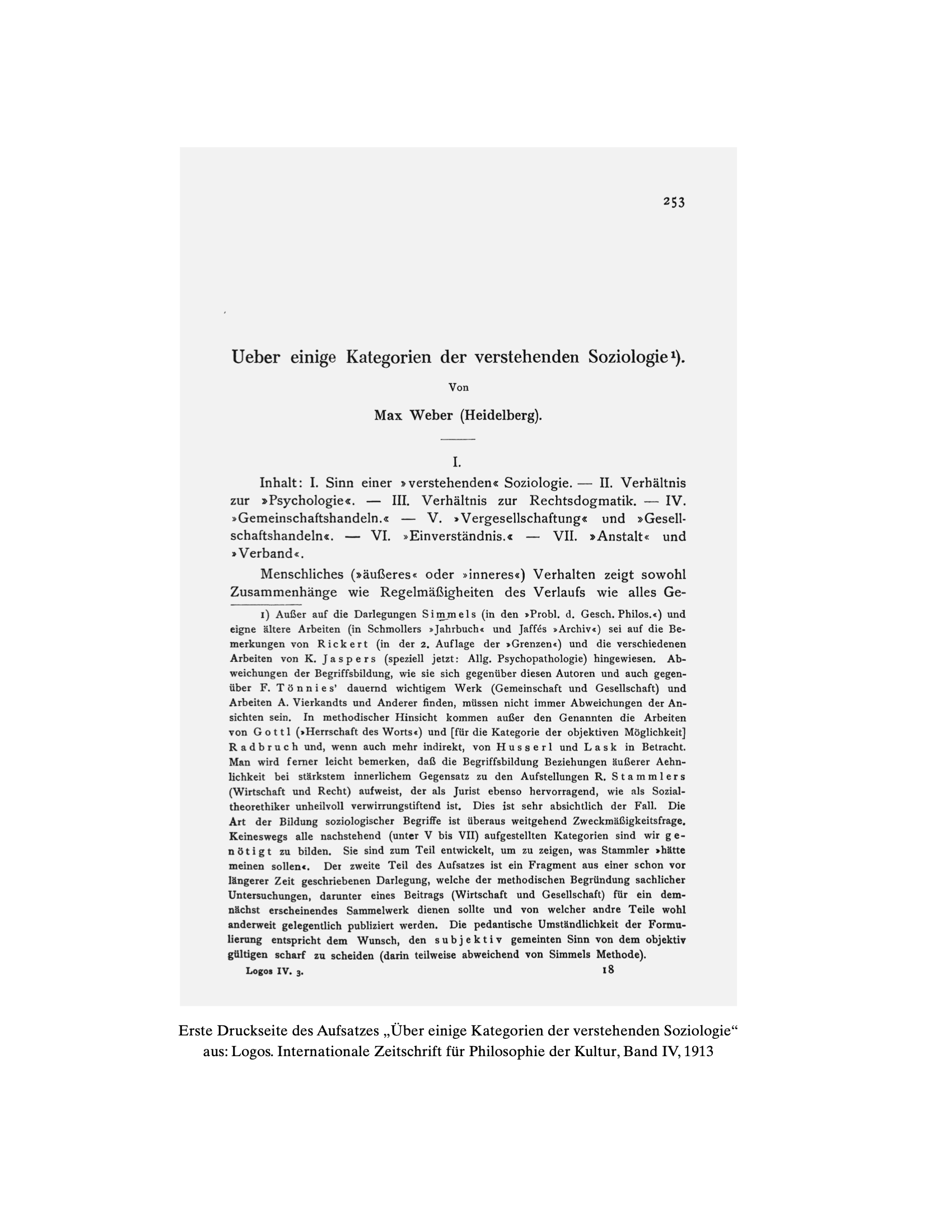 Er ist aber noch vor Ende November im „Logos“-Heft erschienen, Auf Webers Anfrage nach den Korrekturbögen antwortete Paul Siebeck: „Ihr Logos-Beitrag kommt in das nächste Heft. Ich habe ihn provisorisch umbrechen lassen, da er sich so leichter liest, als in Fahnen. Die Abzüge gehen heute an Sie ab“. Brief von Paul Siebeck an Max Weber vom 13. November 1913, Staatsbibliothek zu Berlin – Preußischer Kulturbesitz, Nl. 488 (Archiv des Verlages Mohr Siebeck), A 0703, Mappe 19.
