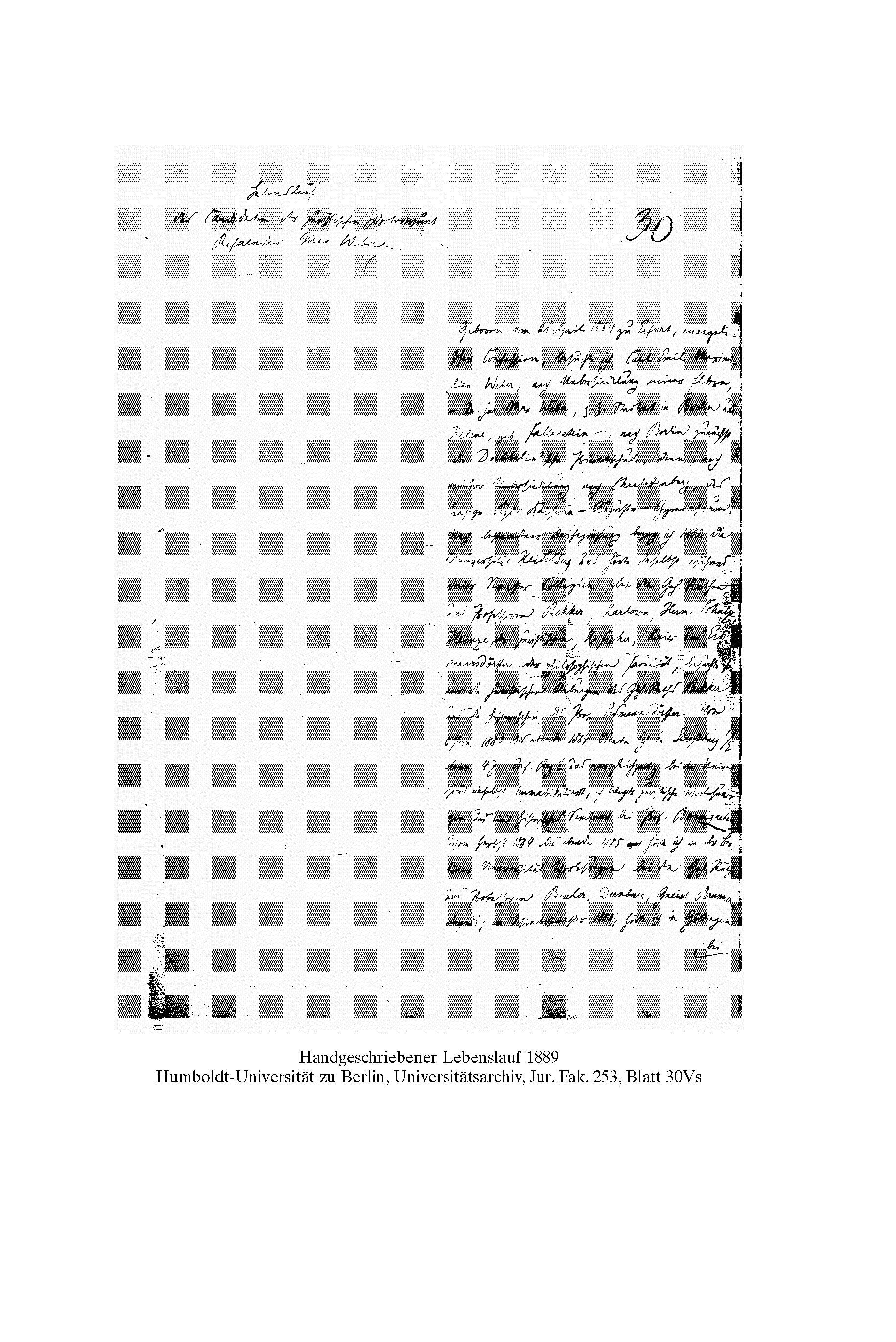 ebenso wie er auch die Dissertation entgegen der ursprünglichen statutarischen Anforderungen auf Deutsch abgefaßt hatte. In diesem handschriftlichen Lebenslauf machte Weber genauere Angaben über seine fachlichen Interessen und über seine geplanten, weiteren Forschungsschwerpunke als in den beiden nachfolgend verfaßten Lebensläufen. Humboldt-Universität zu Berlin, Universitätsarchiv, Jur. Fak. 253, Blatt 29Vs.
