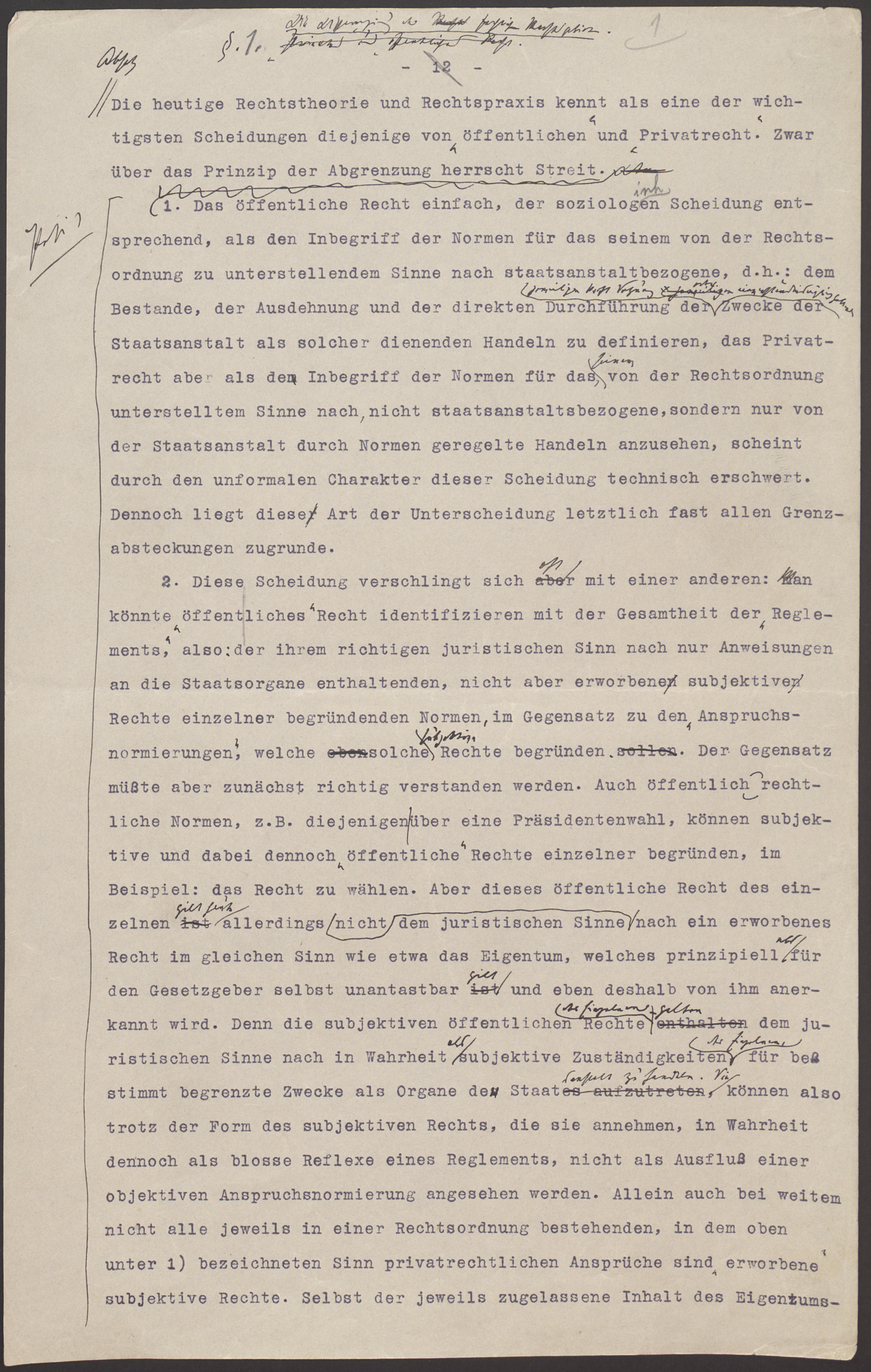 Die begriffliche Unterscheidung wie das sachliche Komplementärverhältnis von „subjektivem Rechtsanspruch“ und „objektiver Rechtsnorm“ sind aber eng verbunden mit der im § 2 thematisierten „Entpersonalisierung“ und „Versachlichung“ des Rechts. Soweit diese Prozesse eine normativ regulierte Rechtssetzung und -durchsetzung auf der Grundlage von „Gewaltenteilung“ voraussetzen und daraus weitere Leitdifferenzen des modernen Rechts generieren, sind zugleich die Themen der Typoskriptvorlage des späteren § 1 benannt, der deshalb vielleicht einmal die Darlegungen der Typoskriptgrundschicht des § 2 fortgesetzt hat, bevor Weber die Manuskriptseiten umstellte. Vgl. unten, S. 275 ff., 369.