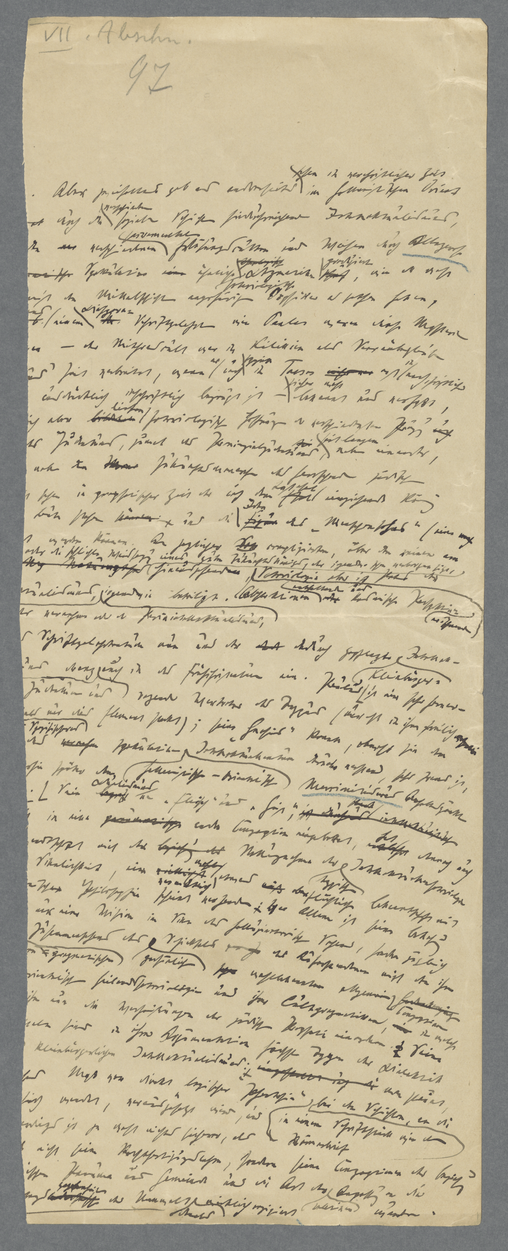 Im folgenden ist ein einseitiges, handschriftliches Fragment Max Webers als Faksimile abgedruckt und in Transkription wiedergegeben. Es findet sich im Nachlaß Max Weber in der Bayerischen Staatsbibliothek, Deponat Max Weber-Schäfer, Ana 446. Der Bogen ist am linken Rand abgeschnitten und von Max Weber mit schwarzer Tinte beschrieben. Von dritter Hand sind am oberen linken Blattrand der Zusatz „VII. Abschn. 97“ sowie zwei Unterstreichungen mit blauem Stift im Text eingefügt. Letztere stammen vermutlich vom Setzer, der zwei Worte nicht lesen konnte. Bei dem vorliegenden handschriftlichen Fragment handelt es sich daher mit größter Wahrscheinlichkeit um die direkte Druckvorlage zu Seite 292 der Erstausgabe von „Wirtschaft und Gesellschaft“. Die Edition (oben, S. 278, Zeile 16 bis S. 280, Zeile 24) folgt der Erstausgabe und berücksichtigt das Manuskript Max Webers an den Stellen, wo es sich bei den Erstherausgebern um fehlerhafte Lesungen und sinnverändernde Abweichungen handelte. Die Transkription des Manuskripts erfolgt mit den in der Briefedition üblichen diakritischen Zeichen.
