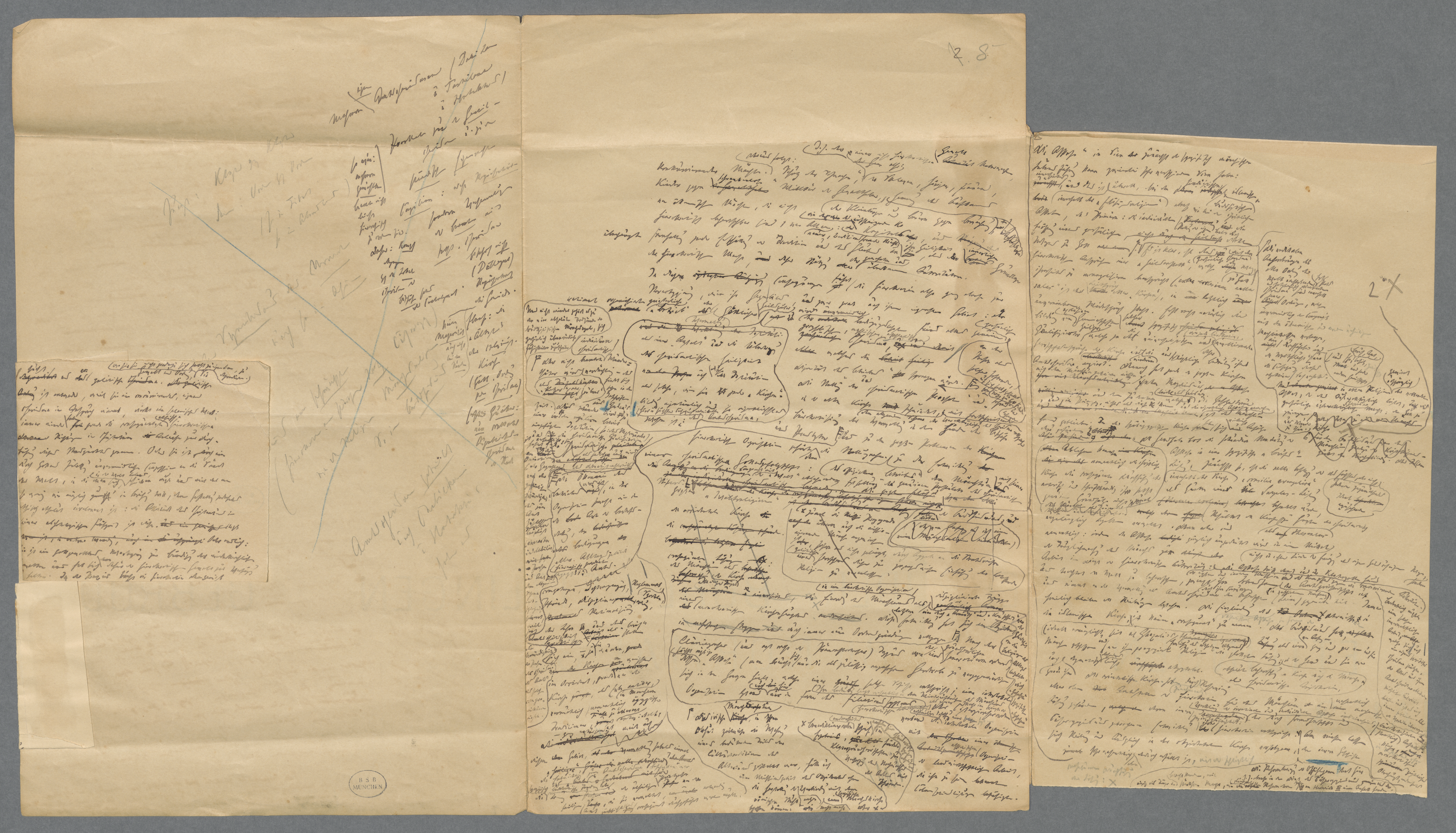 [712]Der nachfolgende Passus ist mit schwarzer Tinte geschrieben und mit blauem Stift (vom Setzer?) gestrichen worden. Die Notizen finden sich in zwei Spalten angeordnet am äußersten rechten Rand der Blattrückseite. Die linke Spalte enthält offentsichtlich Ergänzungen zu den Aufzeichnungen in der rechten.