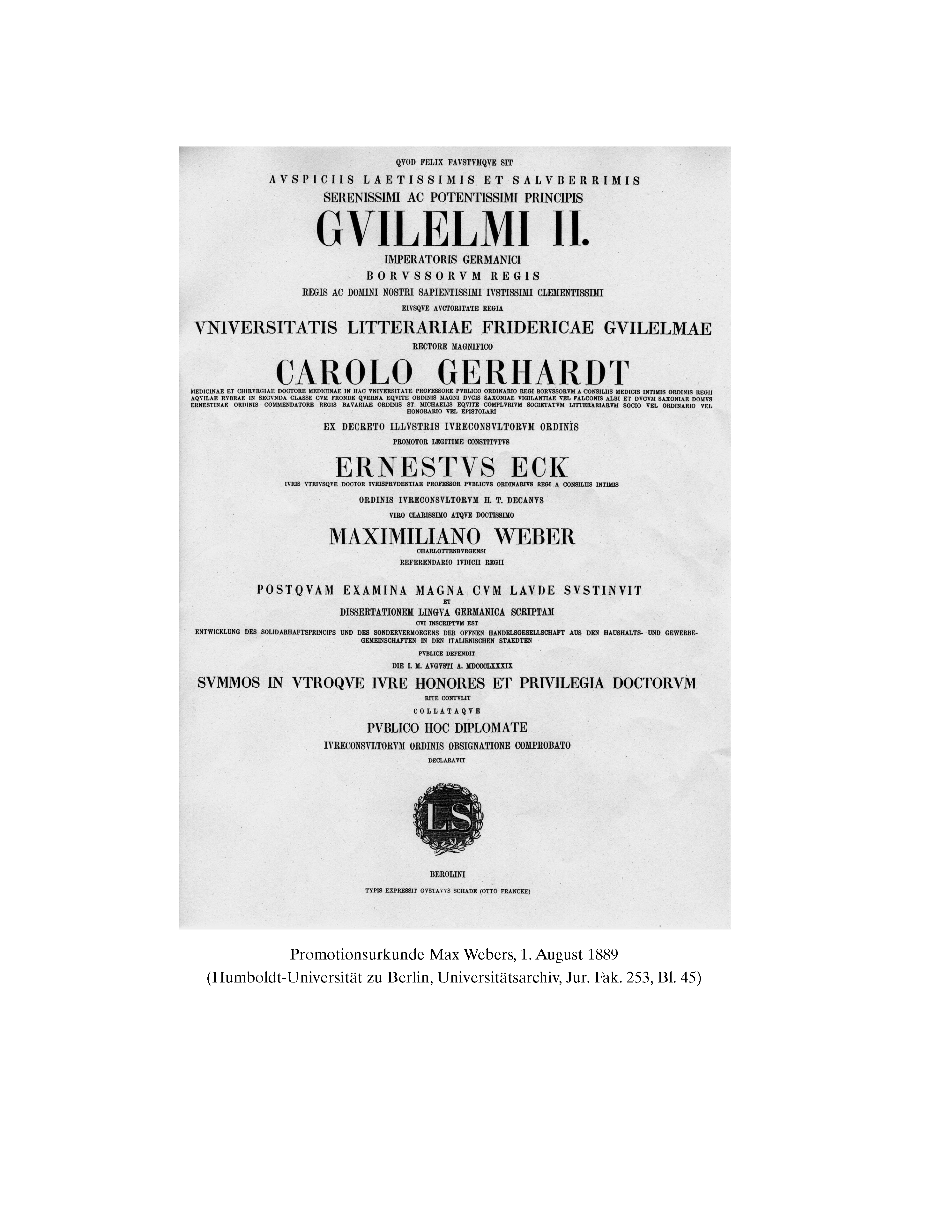 2. Levin Goldschmidt, Gutachten vom 14. Dezember 1891, und Otto Gierke, Gutachten vom 18. Dezember 1891 zu Max Webers „Zur Geschichte der Handelsgesellschaften im Mittelalter. Nach südeuropäischen Quellen“, sowie Fakultätsvotum vom 18. Dezember 1891 im Habilitationsverfahren