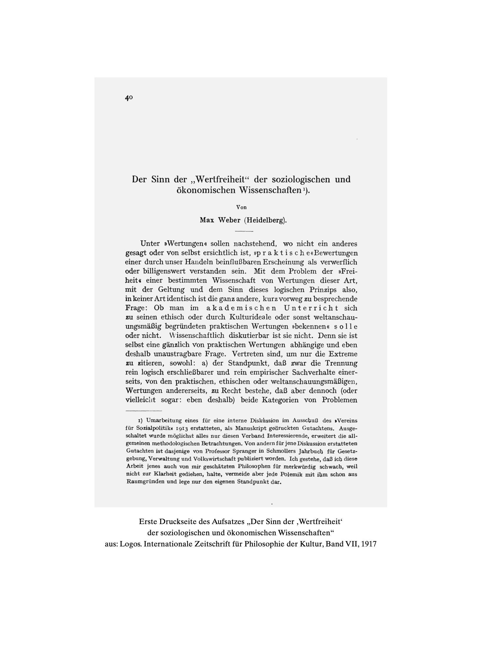 Im Januar 1914 hatte im Verein für Sozialpolitik die im Herbst 1912 beschlossene interne Debatte zur Problematik der Wertfreiheit stattgefunden.