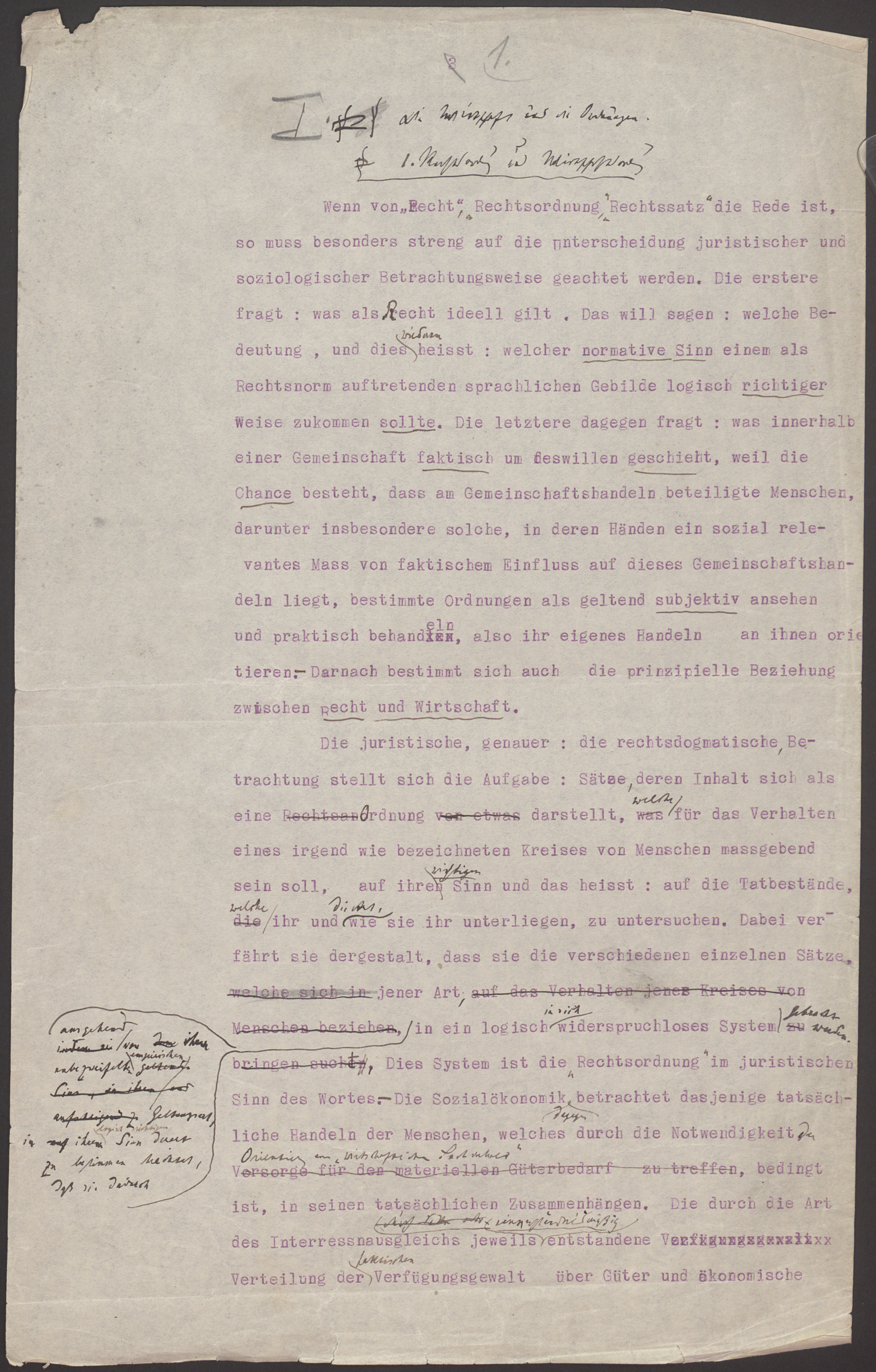 Eine weitere Veränderung kommt hier zum Tragen. Die römische Bezifferung des Manuskripts („I.“), die Weber nach mehreren Anläufen einer letztlich [179]verworfenen Paragrapheneinteilung wählt, könnte durchaus die im Werkplan vorgesehene vordere Position stützen.